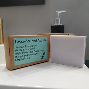 Homemade soap bar. Lavender vanilla scented. Made with Triple Butter Soap base (Mango Butter, Coco Butter, and Shea Butter). Each bar weighs 4oz.
