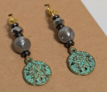 Patina sand dollar earrings with vintage faux black pearl bead accents