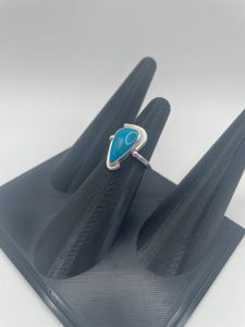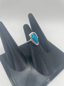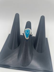 0 savesThis one-of-a-kind ring highlights the natural beauty of Blue Mohave Turquoise. The 16x10mm stone is set in bright, tarnish-resistant Argentium silver and framed with a delicate smooth bezel with an offset boarder that adds a fun whimsical element to the design.