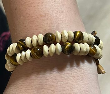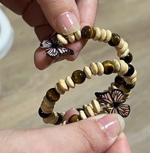 0 savesThis memory wire bracelet is made with natural wood beads and tiger’s eye beads. The bracelet is accented with two wooden butterflies, symbolic of freedom and grace.