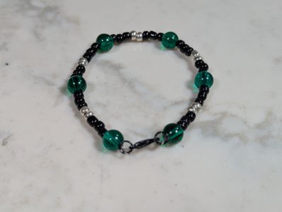 0 savesHandmade with black, green and silver glass beads, at 7.5 inches. Something to peak the interest of the person who likes black with a pop of color.
