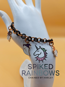 Chainmail bracelet made from Anodized Aluminum rings and enamel charms. Measures to be 8 inches long. Will ship within 3 business days of order.
