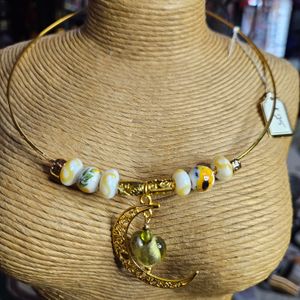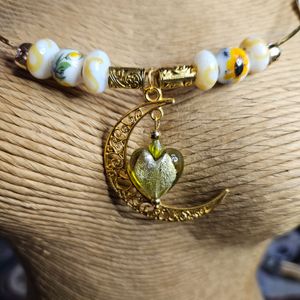0 savesGold Metal Sunflower Ceramic Bead Choker Collar Necklace. Crescent Moon with Green Glass Heart.