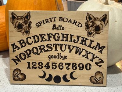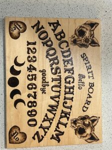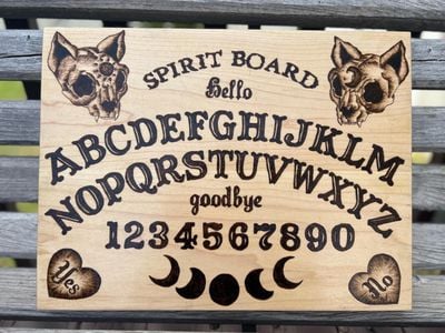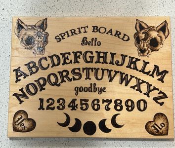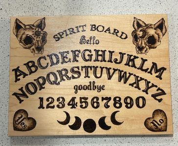 This is my first-ever handmade spirit board, completely designed and burned by hand over the course of a week (40+ hours of work!). Crafted from recycled wood I personally thrifted, this 10” x 14” board is filled with detail — two cat skulls, moon phases, and heart designs surrounding “Yes” and “No.”