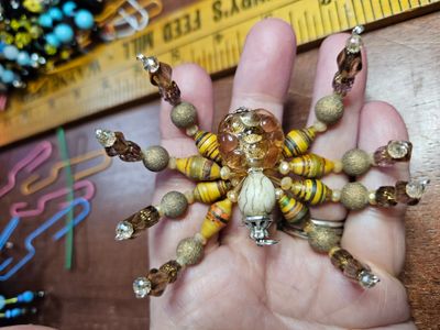 0 savesVintage Glass Beaded Spider. About 3" across. All reclaimed vintage beads. Loop to wear as a necklace, bag charm or hang as a sun catcher. All handmade by me. Custom color orders available.