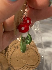Retro inspired mushroom and peace sign earrings with red mushroom lampwork glass bead and green peace sign bead. Connect with your inner hippie! 1.25 drop length.