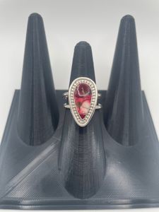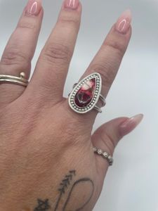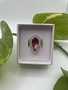 Handcrafted in argentium silver, this striking ring features a vibrant Red Rose Dahlia Mohave stone - a fusion of crimson, pink, and gold veining that radiates warmth and passion. The handcrafted bezel is accented with a delicate beaded border, adding both texture and elegance. Each ring is one of a kind, showcasing the natural artistry of the stone.