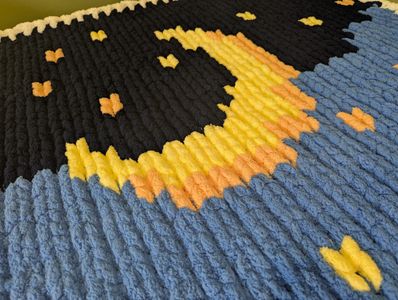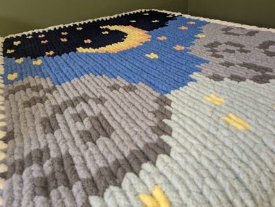 0 savesDrift into dreamland under our "Cloudy Night" Blanket, a breathtaking 45×65in masterpiece that captures the magic of a moody night sky. Featuring a luminous yellow moon at its center, twinkling stars, and swirling clouds in deep blues, soft greys, and rich blacks, this blanket transforms your space into a celestial sanctuary.