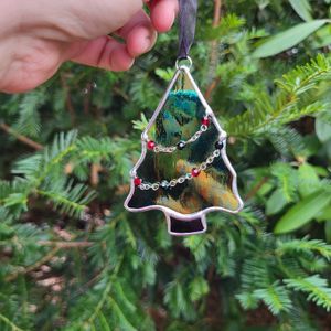 Original handmade stained glass Christmas tree ornament in iridescent green