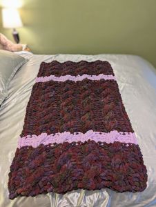 Whimsical comfort. “Garden Sprite” Blanket in red, brown, and purple stripes with cable stitch. 50×30in weighted chenille knit for earthy and magical snuggles. 🌿✨