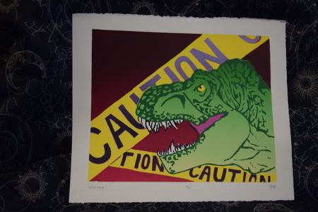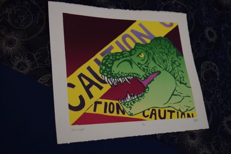 0 saves"Dino-myte",Colored print of a t-rex roaring into the space with caution tape behind it. Majority colors being red, green and yellow.
