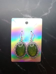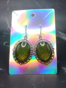 Vintage style green glitter pendant earrings with stainless steel leverback french earring hooks.