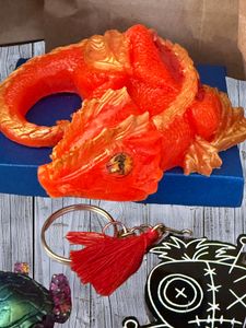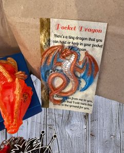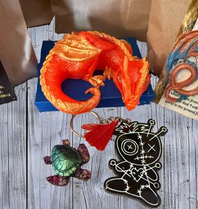 Possible items that can be included: A large dragon, keychain, 2 pocket critters (cryptids or dragons), a turtle, and some stickers.