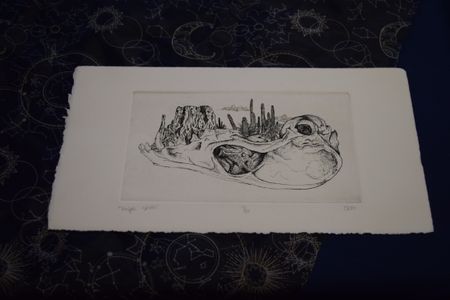 0 saves"Vulpes Zenda", Black and white print on rustic paper, the top half of a fox skull upside down with the traditional western landscape images like cacti and ragged peaks. 7x14