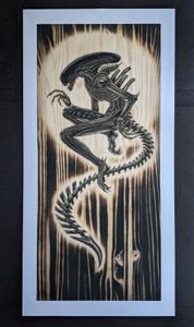 A sleek, sensual encapsulation of the ultimate rebellion of nature, our inner shadow & folly of man's violent ego. The perfect organism; she will not be contained. Horror is such an interesting genre for storytelling, you can explore very complex themes in visceral ways. Alien has many patriarchal and feminist subtexts. Pyrography linework & charcoal shading w/ a torched pinstriped pine background now in print - Those of you who have followed me for awhile know how much time this has taken. The detailing is just absolutely crazy. I like to think wherever HR Giger is now he's smirking devilishly