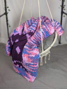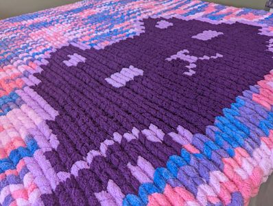 Playful purr-fection! “Peek-a-Boo Cat” Blanket features a purple kitty on blue/pink background. Oversized 55×70in, ultra-soft chenille - approved by Miss Midge! 😻
