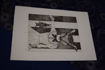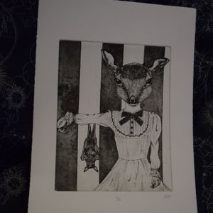 0 saves"Unnamed", Black and white print of deer girl with four eyes in an old Victorian dress with long claws holding out her right arm with a bat hanging off of it. 9.5x13.5