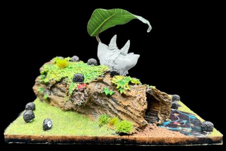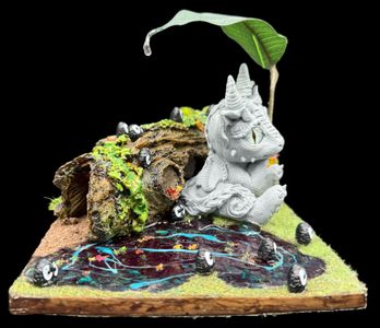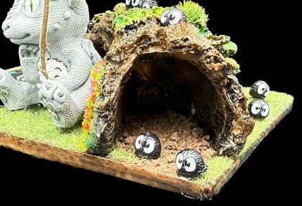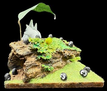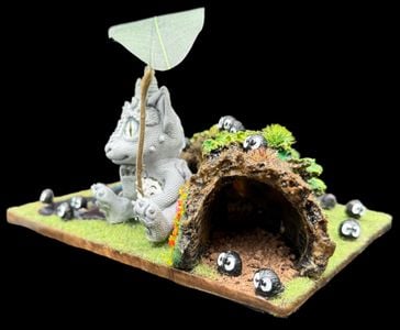 0 savesStep into the magical world of Totoro with this enchanting tribute. Totoro, the lovable forest spirit, sits under his iconic leaf umbrella, keeping dry as he relaxes in the woodland setting. Surrounded by the mischievous soot sprites, this one-of-a-kind piece captures the whimsy and charm of Studio Ghibli's beloved classic. The lush green surroundings, detailed foliage, and playful sprites bring the spirit of the forest to life in miniature form. A must-have for any fan of My Neighbor Totoro, blending innocence and magic in one stunning creation.