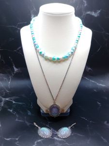 0 savesVintage style silver pendant earrings, pendant necklace, and imitation pearl necklace set. Made with glass cabochons and a resin underlay with aurora color holographic mica powder to create a unique color shift effect that changes beautifully in various light. The vintage style pendant necklace is on a stainless steel electroplated rainbow chain with a magnetic closer. The imitation pearl necklace is made with varying size imitation pearl beads that are a mixture of gradient green, blue, yellow and white color pearls and gradient light pink, light blue, light purple, and white pearl beads with a silver lobster claw closer. The matching vintage style pendant earrings are on sterling silver plated stainless steel french leverback earring hooks.