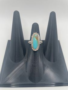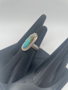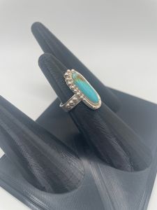 0 savesThis one-of-a-kind ring highlights the natural beauty of Kingman turquoise, known for its vivid sky-blue color and earthy brown matrix. The 6x18mm stone is set in bright, tarnish-resistant Argentium silver and framed with a delicate beaded border that adds dimension and elegance.