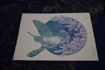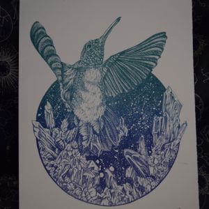 0 saves"Stand Still", Gradient color print of a hummingbird mid flight with crystals around it. 10x13
