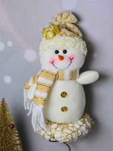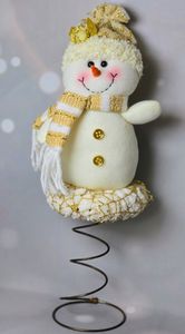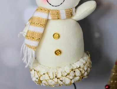 0 savesThis elegant snowman tree topper blends handcrafted artistry with festive sophistication. Made from a repurposed bedspring base, it features soft cream fabric, a gold knit hat and scarf, button accents, and a white chunky yarn “snow” base. Each piece is individually made to add a warm, upscale touch to your holiday décor.