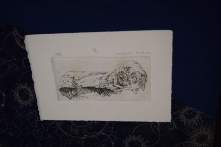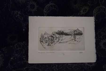 0 saves"Raphus Cucullatus", Black and white print on rustic paper, the jaw of a dodo bird upside down with a winter forest peaks nestled into it. 5 x 8.5