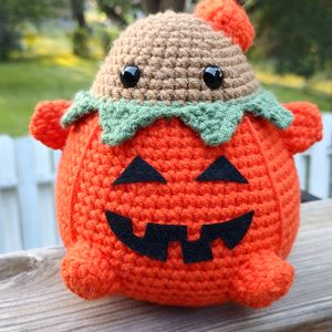 Potato in a pumpkin outfit. This crochet potato plush is ready for Halloween!