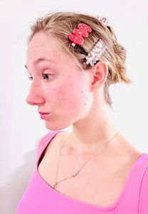 2 sparkly barrettes, choose your size, but be surprised! It’s a grab bag of crazy shapes and styles. Exact glitter color & watermelon varies. Best for kids or adults with thinner hair.