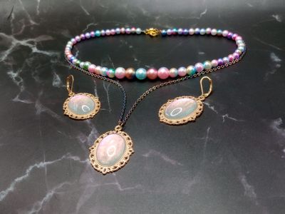 0 savesVintage style light gold color pendant earrings, pendant necklace, and imitation pearl necklace set. Made with glass cabochons and a resin underlay with rose fairy color holographic mica powder to create a unique color shift effect that changes beautifully in various light. The vintage style pendant necklace is on a stainless steel electroplated rainbow chain with a magnetic closer. The imitation pearl necklace is made with varying size beads that are a mixture of gradient rainbow pearls and gradient light blue, pink and white pearls, with a gold lobster claw closer. The matching vintage style pendant earrings are on 24K gold plated stainless steel french leverback earring hooks.