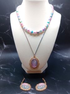 Vintage style light gold color pendant earrings, pendant necklace, and imitation pearl necklace set. Made with glass cabochons and a resin underlay with rose fairy color holographi...