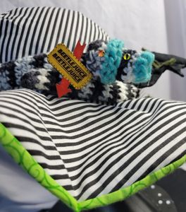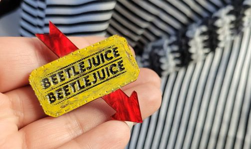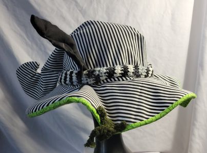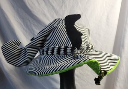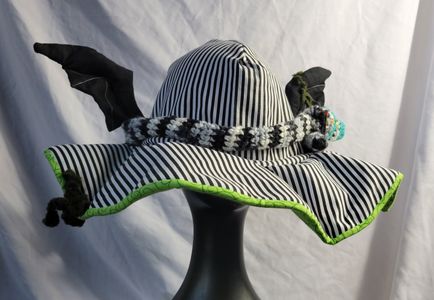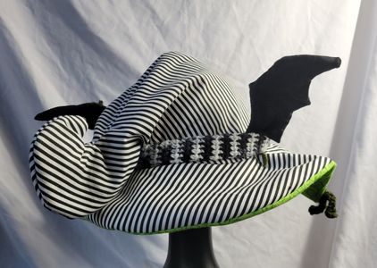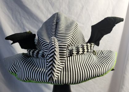 0 savesLooking for a ghoulish spin on your old favorite 80s icon? This hat is perfect for you! With a wormy neitherland pal slithering around this bat winged witch hat is perfect for your cosplay! Made from cotton it is approximately 23in around. Comes with two interchangeable pins. One is made from acrylic the other is wood.