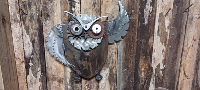 This custom one of a kind owl is crafted from 100% all recycled materials and hand made