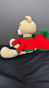 Crochet with acrylic yarn, 8” seated. Removable red and green hat. Tan colored bear.