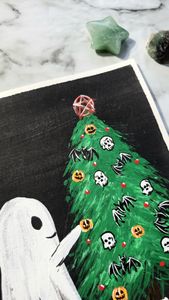 This cute little ghost could put a smile on even the most spooky person's face. With a little bit of holiday spirit he finds the little joy in life of decorating his tree with skulls, bats and pentagram ornaments.