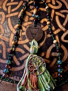 This talisman is made with steady focus and respect for the work. The wooden pendant is hand-burned with the symbol for Earth, set into a warm walnut stain so the lines sit deep and dark. The strand is built on a leather cord, carrying the steady weight of medium and dark wood beads mixed with green glass. The colors and textures come together with that grounded, rooted feeling the Earth element is known for.