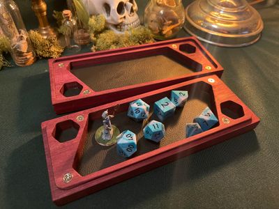 0 savesThese are a step above the dice vault in terms of storage capacity! Keeping the same high quality of work, these will hold up to 4 sets of dice! They have also been designed to hold the classic 25mm spindown life counter d20’s commonly used in Magic: the gathering. The dice dungeon also makes a great compact dice rolling tray for when space is precious. These are of course made with pure hardwood, carved on the CNC for precision and lined with genuine laser cut leather to ensure a perfect fit.