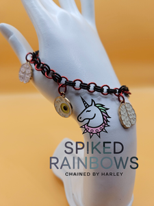 Chainmail bracelet made from Anodized Aluminum rings and enamel charms. Measures to be 8 inches long. Will ship within 3 business days of order.