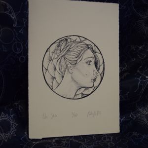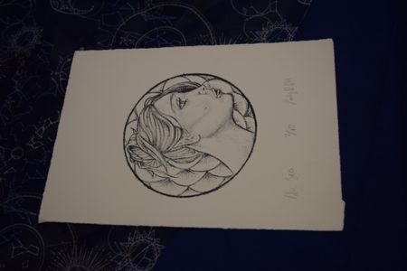 0 saves"The Sea", Lithograph black and white print of woman looking to the right with elf ears and pattern behind her. Only one print available. If we get a lot of requests for it we may do a pdf/digital selling of it. 6x8.5