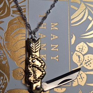 0 savesFeeling Stabby Mini Brass Knife Necklace. Real Mini Knife on Sterling Silver 18" Necklace. About 1.5" long.