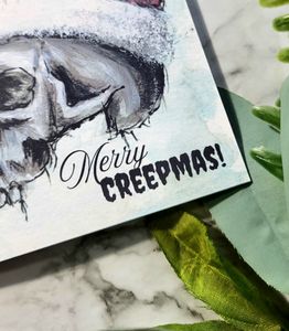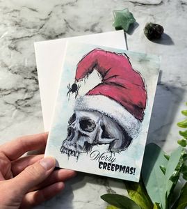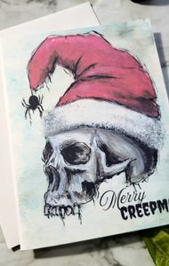 Blank greeting cards featuring my original Skull St Nick painting. Do you like sending snail mail or looking for a unique greeting card to gift to a friend? Choose your quantity of black Merry Creepmas cards. Send a unique card out this year to your spooky friend! Details: -Includes: 1, 2 or 4 cards with white envelopes -Measures 4 1/4x5 1/2" (A2) Single cards will be sent via USPS envelope with no tracking number, multi packs will be shipped in a stay flat mailer via USPS advantage with a tracking number.