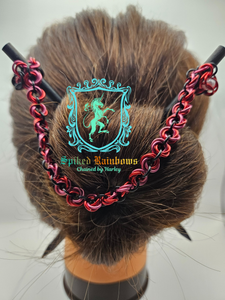 0 savesAnodized Aluminum rings in a Mobius weave attached to wooden hair sticks. Chain measures to 7 inches long. Will ship within 3 business days of order.