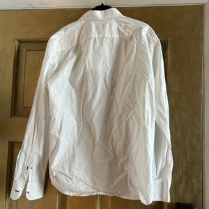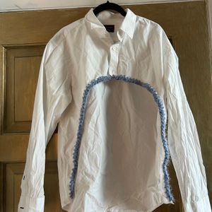 One of a kind button down shirt. Men’s large turned cute cut out top with crochet (done by me) edges. Fuzzy blue yarn around cut out. I think it would be so cute with a tie poking out from underneath and a black top for contrast. Machine washable, gentle cycle. Includes s&h.