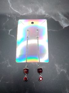 Long dangle earrings with red and clear cracked glass beads and red rhinestones with stainless steel leverback french earring hooks.