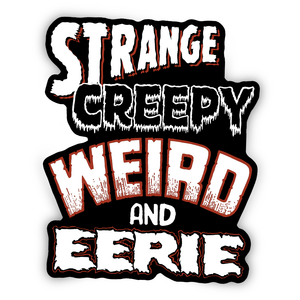 Strange, Creepy, Weird and Eerie. 4" sticker, outdoor vinyl.