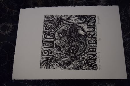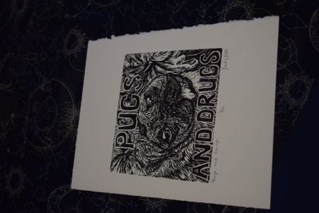 "Pugs and Drugs", Black and white print on rustic paper.
