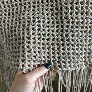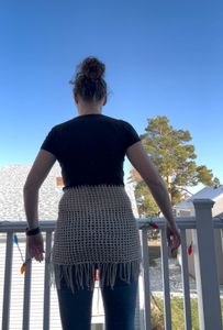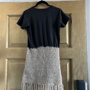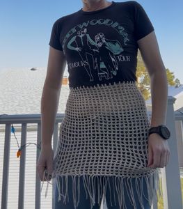 One of a kind Fleetwood Mac short turned flirty concert-wear. Bottom half is crocheted by me. It has a loose weave and is see through, with fun fringe at bottom. Would fit an xs best. I would typically wear a small and you can see this is tight on me. Machine wash gentle cycle. Includes s&h.