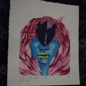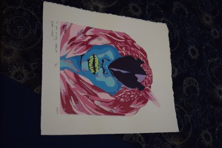 0 saves"It was a very difficult game indeed", colored silk screen print, of a woman with a mask over her eyes and bright green lips and neon pink hair. Prominent colors being pink, blue and green. 11x12.5