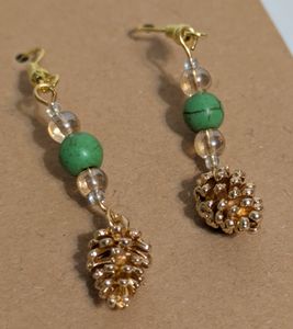 Copper pinecone dangling earrings; green bead accents