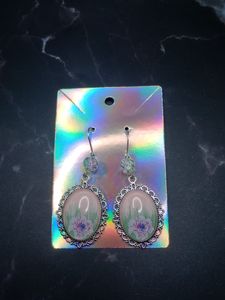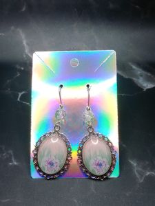 Vintage style pendant earrings with pale pink and green background, pink flowers, and pale pink and green glass accent beads with stainless steel leverback french earring hooks.